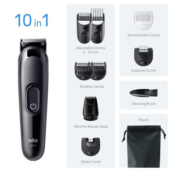 Braun's All-in-One Grooming Kit for men. The 10in1 Tool Kit lets you effortlessly trim your face and hair. Comfortably achieve precision and efficiency in no time with the Ultra Sharp Blade. Stay in full grooming control with 14 length settings. Includes washable heads and combs and a cleaning brush for quick and effortless cleaning. Braun AIO Series 3, built to last, 50-min runtime.Box content: 1 trimmer, 7 combs, 1 attachment, 1 cleaning brush, 1 pouch