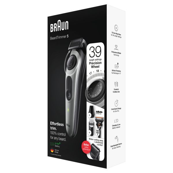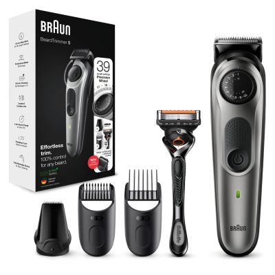 Achieve your style effortlessly with the Braun BT5 beard trimmer and hair clipper for men. This beard trimmer is sharper, faster and more efficientラwith a wider cutting area to capture and cut more hair in every stroke*. Beard Trimmer 5 includes a precision dial with 39 length settings, lifetime sharp blades, and Li-Ion battery. With washable trimmer head and combs.*vs. previous Braun trimmersBox includes:1x Beard trimmer & hair clipper2x Precision beard & hair combs1x Detail trimmer head1x Fusion Proglide1x Cleaning brush1x Smart plug charger1x User manual