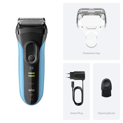 Braun Series 3+ electric shaver offers a close and comfortable shave. 2 foil shaving elements and 1 center trimmer to shave longer hairs. Flexible blades adapt to follow the contours of your face. Efficiency MicroComb, captures more hairs in one stroke (vs previous Braun Series 3, tested on 3-day beard). Precision trimmer, to precisely contour sideburns or mustache. Thin shaving head, for an easy shave even in hard-to-reach areas. The Series 3+ electric razor for men is waterproof. Made in Germany. Box content: 1x Braun Series 3+ shaver, 1x protective cap, 1x charger, 1x cleaning brush