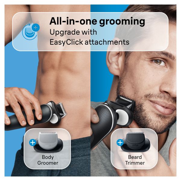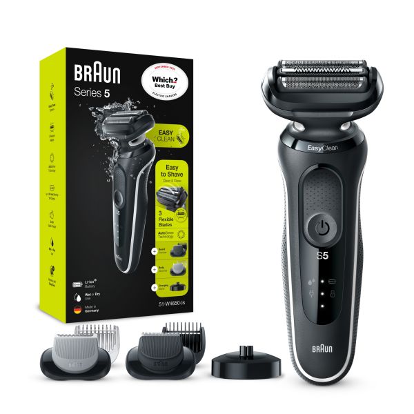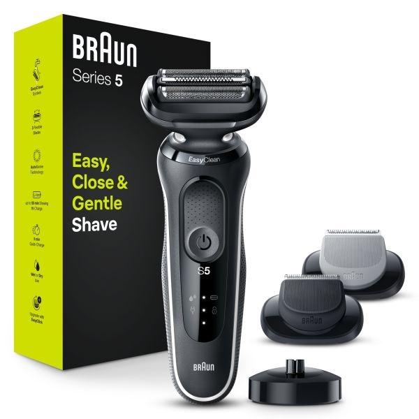 Braun Series 5 electric shaver for men makes shaving easy with 3 Flexible Blades that adapt to your facial contours. The EasyClean system delivers a fast and easy cleaning without removing the shaver head.The Li-Ion Battery provides up to 3 weeks of shaving and a 5 min quick charge. This men's electric shaver is 100% waterproof for Wet & Dry use.Compatible with EasyClick to upgrade your shaver.Box includes:1x Series 5 Electric razor for men1x Beard trimmer attachment1x Body groomer attachment1x Charging stand1x Protective cap1x Smart plug for automatic 100-240 voltage adjustment1x Cleaning brush