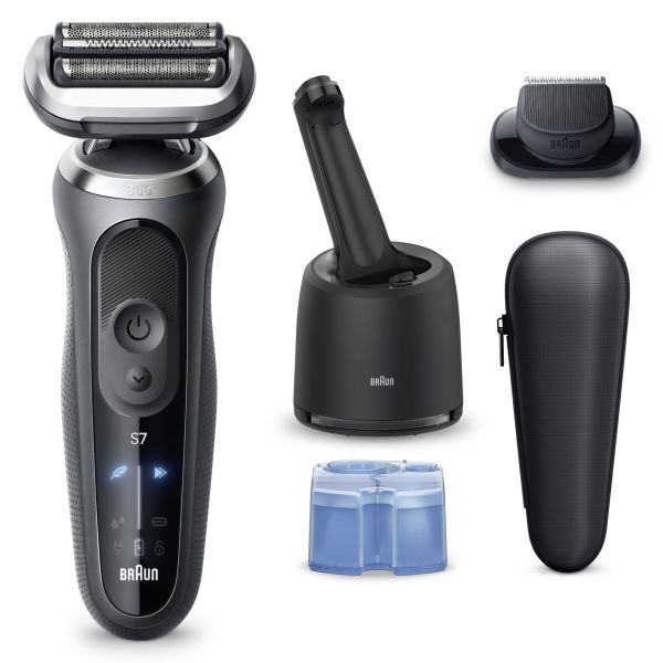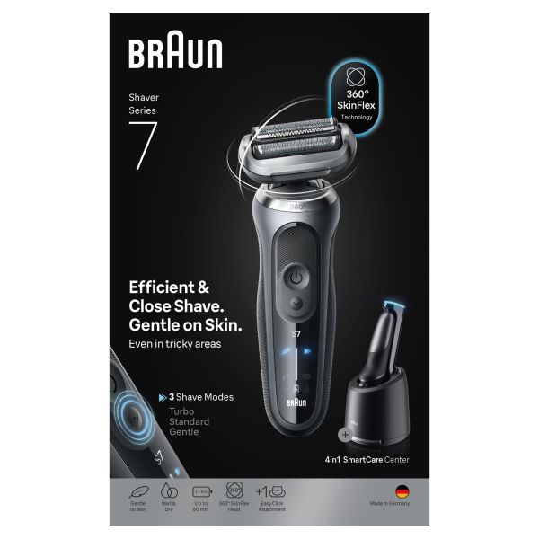 Braun Series 7 electric shaver offers a closer and faster shave than ever before (vs. pevious Series 7). The 360ᄚ SkinFlex Head adapts to your contours for an ultra smooth shave. 3 shave modes: Turbo Mode, Gentle and Standard Mode, allow you to personalize your shave to your needs. Includes the 4in1 SmartCare Center. Ensures optimal cleaning and maintenance of the electric shaver. With a Li-Ion battery offering up to 60-min of cordless runtime and 5-min quick charge. The Series 7 electric razor for men is 100% waterproof. Made in Germany. Box includes: 1x Series 7 shaver, 1x travel case, 1x charger, 1x cleaning brush, 1x 4in1 SmartCare Center, 1x shaver care cartridge, 1x Precision Trimmer attachment