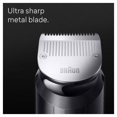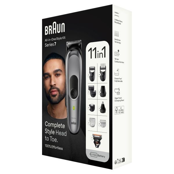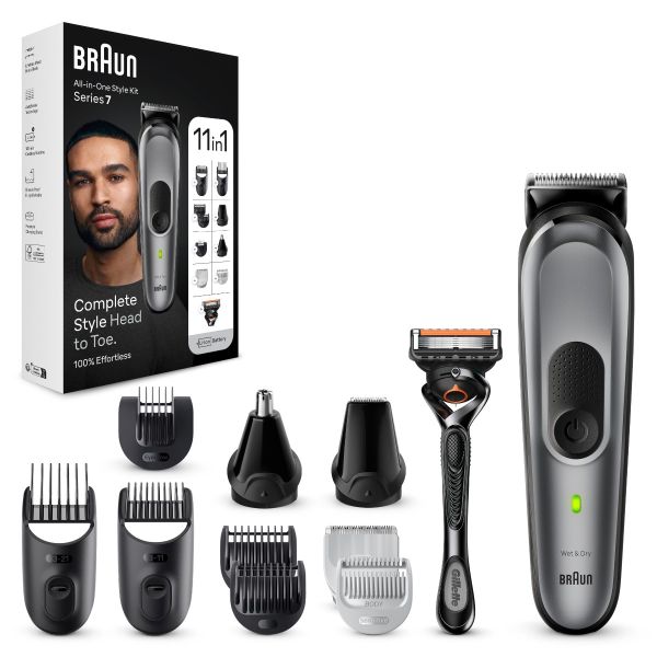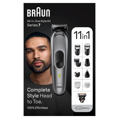 Groom from head to toe using the Braun All-In-One Style Kit Series 7. Grooming kit made for beard, hair, details and manscaping. With ultra sharp metal blade, AutoSense technology and a 100-minute runtime.