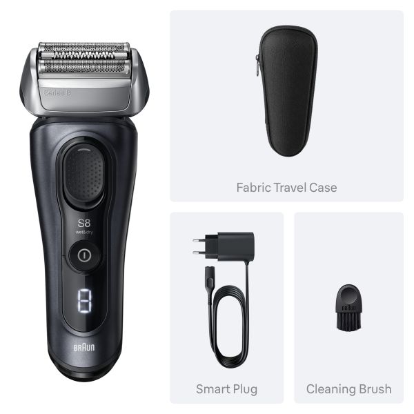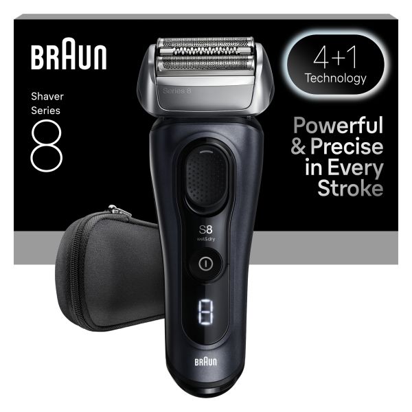 Braun Series 8 electric shaver offers precision and efficiency. 4+1 Technology: Precision Shaving Head & Trimmer, with OptiFoil Specialized Blade and SensoAdapt for a close shave even under the chin and neck. This premium electric razor provides a powerful and gentle shaving experience. With a Li-Ion battery offering up to 60-min of cordless runtime and 5-min quick charge. The Series 8 electric razor for men is 100% waterproof. Made in Germany. Box content: 1x Braun Series 8 shaver, 1x travel case, 1x charger, 1x cleaning brush