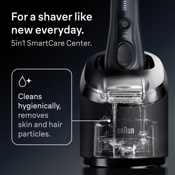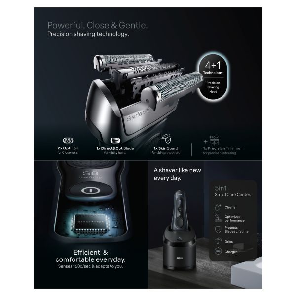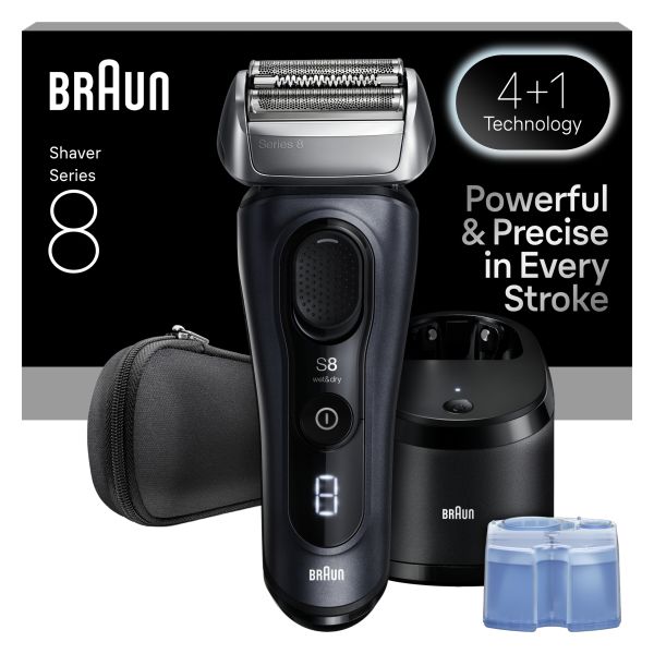 Braun Series 8 electric shaver offers precision and efficiency. 4+1 Technology: Precision Shaving Head & Trimmer, with OptiFoil Specialized Blade and SensoAdapt for a close shave even under the chin and neck. This premium electric razor provides a powerful and gentle shaving experience. Includes the 5in1 SmartCare Center. Ensures optimal cleaning and maintenance of the electric shaver. The Series 8 electric razor for men is 100% waterproof. Made in Germany. Box content: 1x Braun Series 8 shaver, 1x travel case, 1x charger, 1x cleaning brush, 1x 5in1 SmartCare Center, 1x shaver care cartridge
