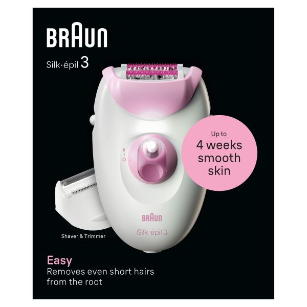 Introducing the Braun Silk-�pil 3 - your hassle-free solution for achieving up to 1 month of smooth skin. Why bother with waxing when you can experience the convenience of epilation? Say goodbye to sticky wax strips.Experience the convenience of corded usage for consistent, salon-like smooth skin right from the comfort of your home. No need to worry about battery life or interruptions.Upgrade from waxing to epilation with the Braun Silk-�pil 3. Embrace the ease and effectiveness of this device, leaving behind the hassle and mess of waxing. Discover the joy of long-lasting smoothness with Braun's trusted technology. Built to last years: our epilators are made in Germany