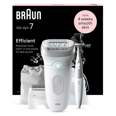 The Braun Silk-�pil 7 ensures up to 1 month of smooth skin, anytime and efficiently. Featuring a wide head, this Wet & Dry epilator covers large areas, capturing more (vs Braun Silk-�pil 5) hair in each stroke. This cordless Braun epilator is equipped with MicroGrip tweezer technology, capable of capturing hairs as short as 0.5mm. Enjoy salon-smooth skin with added comfort, thanks to the massage roller cap that can help reduce pain sensation. Say goodbye to the inconvenience of waiting for hair to regrow with other hair removal products such as wax. This epilator is designed for convenience and eliminates the need for clean-ups or appointments.Tip: for reduced pain sensation, epilate in the bath or shower under warm water. Built to last years: our epilators are made in Germany.