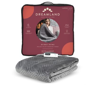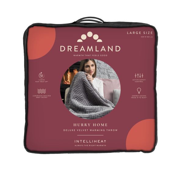 Dreamlandï¾’s Hurry Home Deluxe Grey Velvet Herringbone Quilted Throw is super-soft and perfect to snuggle under, you will be warm and cosy in minutes thanks to the fast heat Intelliheat technology. Cleverly responds to temperature changes while you sleep and relax. Use around the home, living room, bedroom and great for outdoor living to wrap around you to take the chill away.
