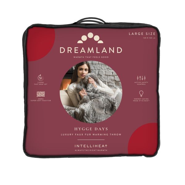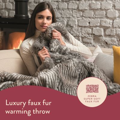 Dreamlandï¾’s fashionable Hygge Days Zebra Print faux fur heated throw is a gorgeous accessory to add to your living room or bedroom, and looks fabulous draped over you or your bed. It is the most luxurious way to snuggle up and watch tv. Keeping you warm and cosy on chilly nights, imagine the warmth around you from being cocooned in super soft strokeable faux fur. The reverse fabric is in a beautiful soft grey micromink fabric. So turn down your heating and stay warm in style.