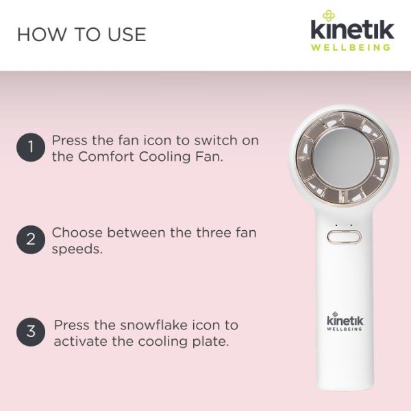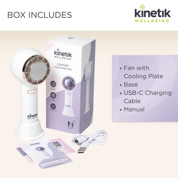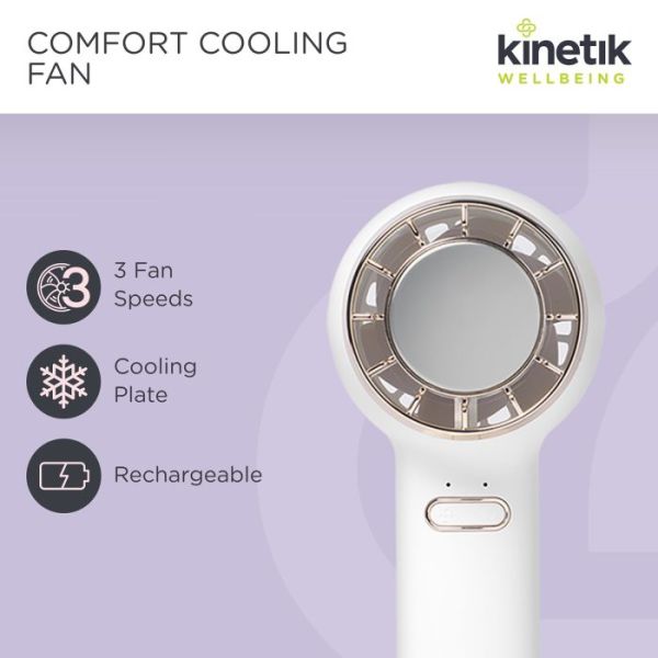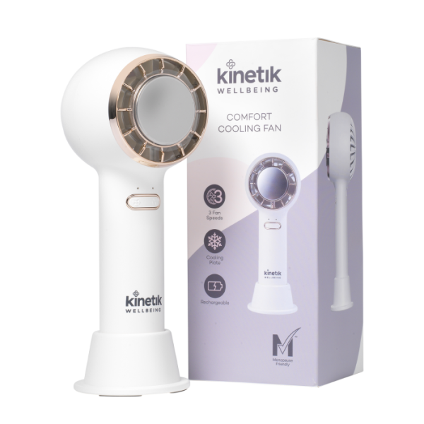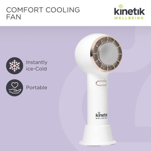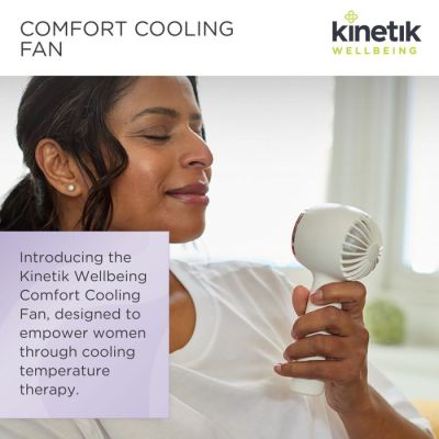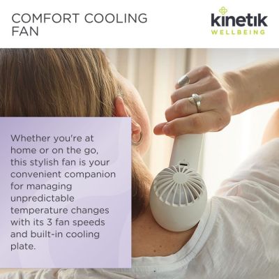 Introducing the Kinetik Wellbeing Comfort Cooling Fan, designed to empower women through cooling temperature therapy. Whether youï¾’re at home or on the go, this stylish fan is your convenient companion for managing unpredictable temperature changes with its 3 fan speeds and built-in cooling plate.