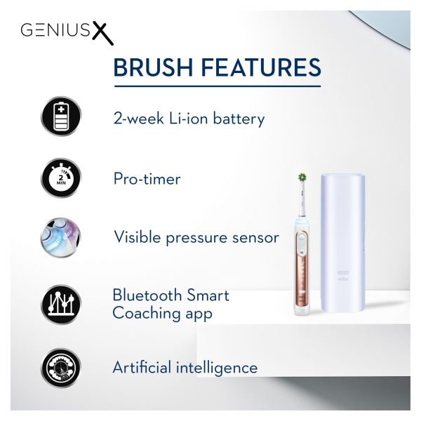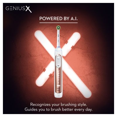 The Oral-Benius X electric toothbrush is equipped with motion sensors and powered by artificial intelligence to recognize your brushing style anduide you to your best results every day. Now it's easier than ever to brush like your dentist recommends for a superior clean, for healthierums. This beautifully advanced toothbrush protects your delicateums and helps prevent from future issues: the combination of the new revolutionaryumuard technology, 360 SmartRing and Pressure Control alert you, reduce speed when you brush too hard and tell you where you overbrush for aentler routine. Last, but not least, it comes with a lithium-ion battery that lasts more than 2 weeks with 1 full charge. With Oral-Benius X, you can'to wrong in brushing.<\p>