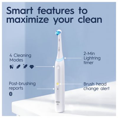 The iO 4 electric toothbrush features Oral-B's best technology, combining a dentist-inspired round brush head with micro-vibrating bristles for a professional purifying clean feel at home. The Smart Pressure Sensor helps prevent you from brushing either too hard or too softly to better protect yourums.umuard alerts you to time spent brushing with too much pressure. Replace your Oral-B iO toothbrush head every 3 months for the best results.<\p>