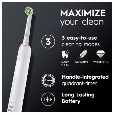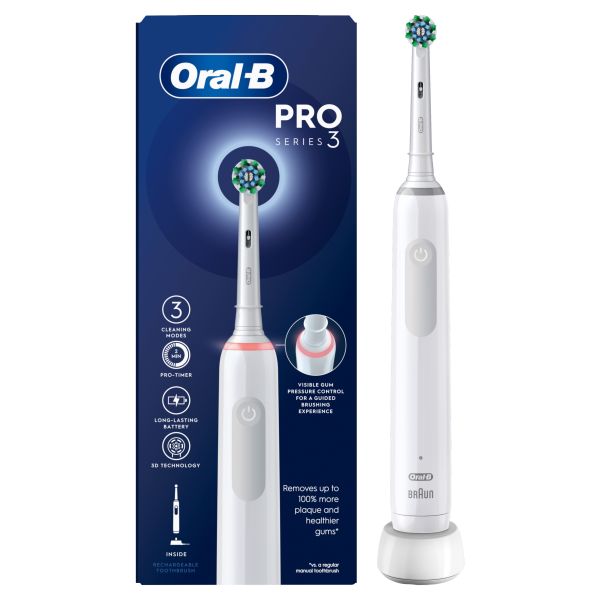 Experience Oral-B Pro 3 from the #1 brand used by dentists worldwide. The sleek handle of the Pro 3 electric toothbrush helps you brush like your dentist recommends: It helps you brush for 2 minutes with the professional timer and it notifies you every 30 seconds to change the area your are brushing. While you are just moving the brush around your mouth, Oral-B's unique round head does all the rest. It removes up to 100% more plaque than a standard manual toothbrush for healthierums and it starts making your smile whiter as of the first day of brushing by removing surface stains. Not only this, but the toothbrush helps you protect your delicateums with the 360 ?gum pressure control technology that reduces brushing speed and alerts you to beentler if you brush too hard. Oral-B Pro 3 is the must have brush for everyone who wants to switch to an electric toothbrush and improve their oral health.<\p>