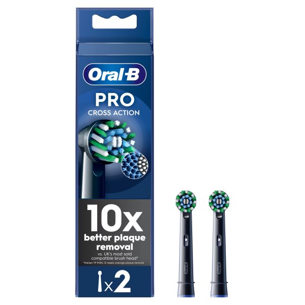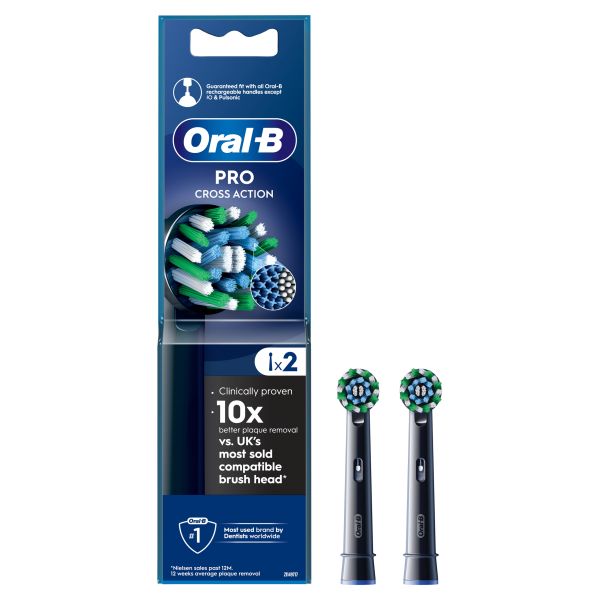 The Oral-B Pro Cross Action toothbrush head features more than 2200 perfectly angled bristles to remove up to 100% more bacterial plaque for cleaner teeth & healthierums vs. a manual toothbrush. Oral-Benuine brush heads are designed with new X-shape bristles that clean in areas that round ones cannot reach. Its brush head usage indicator turns bristles fromreen to yellow showing you when to change for 100% cleaning efficacy.uaranteed fit with Oral-B electric rechargeable toothbrushes except Pulsonic & iO toothbrushes.<\p>