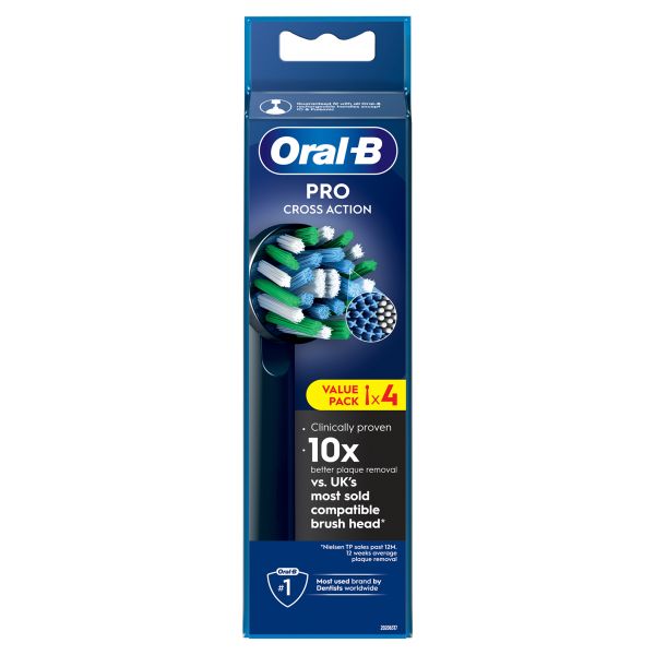 The Oral-B Pro Cross Action toothbrush head features more than 2200 perfectly angled bristles to remove up to 100% more bacterial plaque for cleaner teeth & healthierums vs. a manual toothbrush. Oral-Benuine brush heads are designed with new X-shape bristles that clean in areas that round ones cannot reach. Its brush head usage indicator turns bristles fromreen to yellow showing you when to change for 100% cleaning efficacy.uaranteed fit with Oral-B electric rechargeable toothbrushes except Pulsonic & iO toothbrushes.<\p>