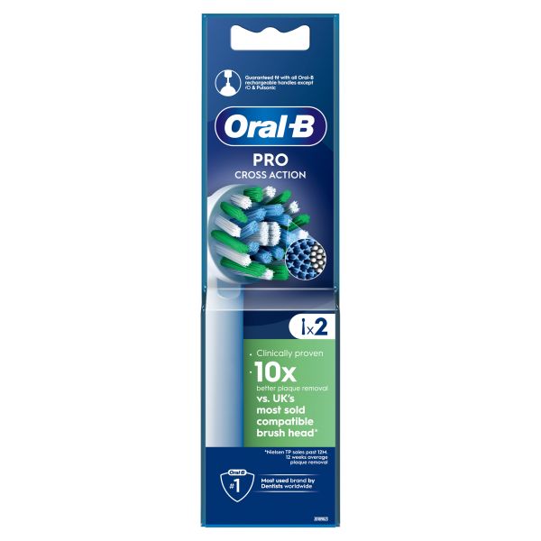 The Oral-B Pro Cross Action toothbrush head features more than 2200 perfectly angled bristles to remove up to 100% more bacterial plaque for cleaner teeth & healthierums vs. a manual toothbrush. Oral-Benuine brush heads are designed with new X-shape bristles that clean in areas that round ones cannot reach. Its brush head usage indicator turns bristles fromreen to yellow showing you when to change for 100% cleaning efficacy.uaranteed fit with Oral-B electric rechargeable toothbrushes except Pulsonic & iO toothbrushes.<\p>