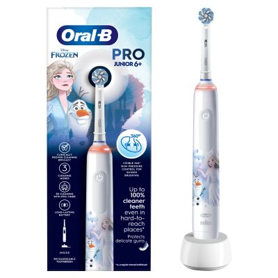 The Oral-B Junior Frozen electric toothbrush for ages 6+ is designed with dentists for a superior clean. To protect children'sentleums, it has a 360 ?um Pressure Control which flashes a red light and reduces brushing speed when it detects brushing that's too hard. Plus, its round brush head has extra-soft bristles. To make brushing even more fun, it can be used with the free Disney Magic Timer App from Oral-B. In fact, 90% of kids brush longer with the app. It's the right brush to help kids brush independently and develop healthy brushing habits to last a lifetime.<\p>