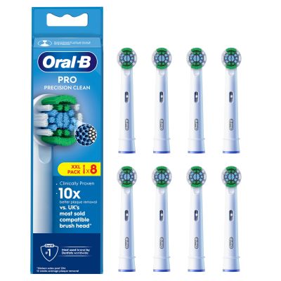 The Oral-B Pro Precision Clean replacement electric toothbrush head bristles brush away plaque for a superior tooth-by-tooth clean than with a regular manual toothbrush. Oral-Benuine brush heads are designed with new X-shape bristles that clean in areas that round ones cannot reach. Its brush head usage indicator turns bristles fromreen to yellow showing you when to change for 100% cleaning efficacy.uaranteed fit with Oral-B electric rechargeable toothbrushes except Pulsonic & iO toothbrushes.<\p>