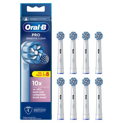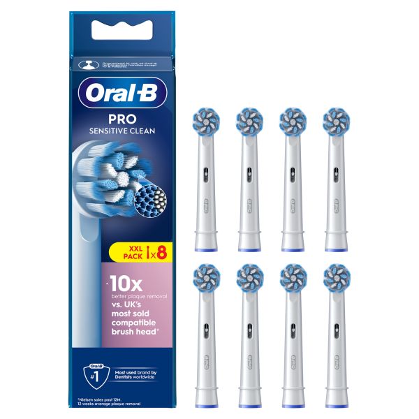 The Oral-B Pro Sensitive Clean features extra soft bristles that areentle onums, combined with regular bristles that are tough on plaque. It removes up to 100% more plaque and reducesum inflammation by 100% compared to a manual toothbrush. Oral-Benuine brush heads are designed with new X-shape bristles that clean in areas that round ones cannot reach.uaranteed fit with Oral-B electric rechargeable toothbrushes except Pulsonic & iO toothbrushes.<\p>