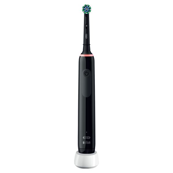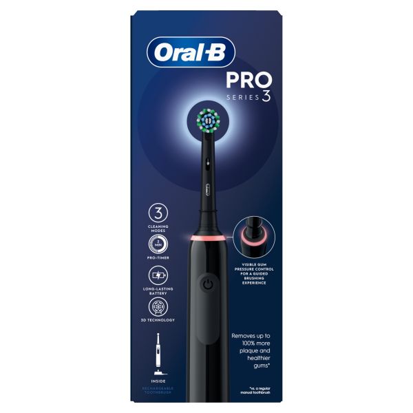 Experience Oral-B Pro Series 3 from the #1 brand used by dentists worldwide. The Series 3 electric toothbrush helps you brush like your dentist recommends: It helps you brush for 2 minutes with the professional timer and it notifies you every 30 seconds to change the area your are brushing. While you are just moving the brush around your mouth, Oral-B's unique round head does all the rest. It removes up to 100% more plaque than a standard manual toothbrush for healthierums and it starts making your smile whiter as of the first day of brushing by removing surface stains. Not only this, but the toothbrush helps you protect your delicateums with the 360 ?gum pressure control technology that reduces brushing speed and alerts you to beentler if you brush too hard. Oral-B Pro Series 3 is the must have brush for everyone who wants to switch to an electric toothbrush and improve their oral health.<\p>